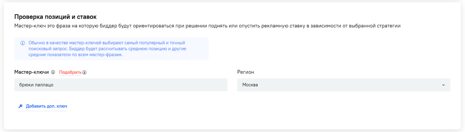 Чтобы точно управлять ставками, можно задать мастер-фразы — запросы, по которым система будет отслеживать позиции товара и корректировать ставку. Обычно достаточно задать 1–3 фразы: