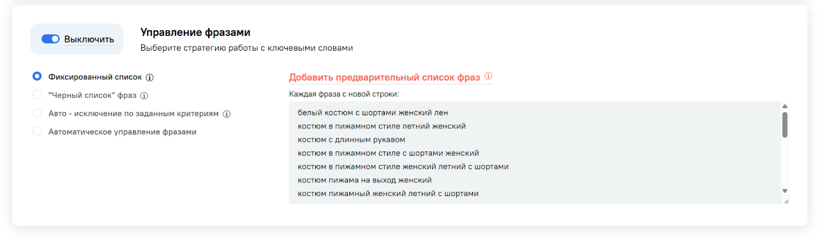 Фиксированный список фраз — показы идут только по выбранным фразам. Это подходит, если точно известно, какие запросы нужно продвигать.