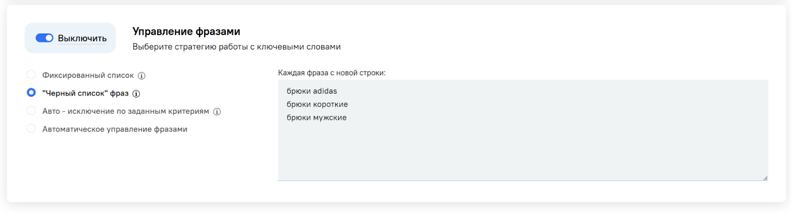Черный список — позволяет исключить нерелевантные и неэффективные фразы: