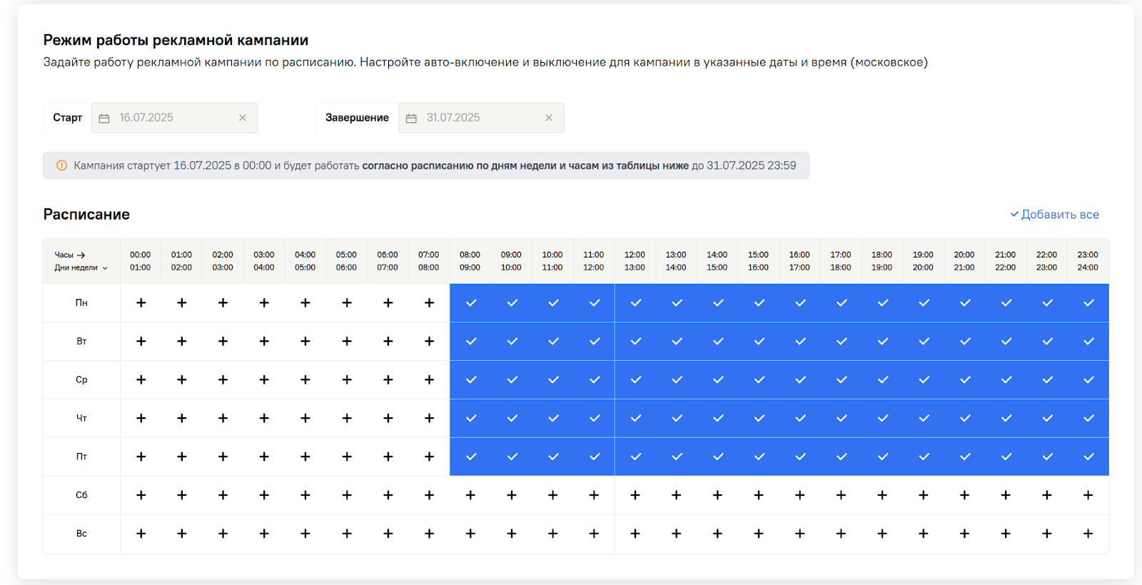 Это удобно, если вы запускаете акции, работаете по будням или хотите показывать рекламу в часы максимального трафика.