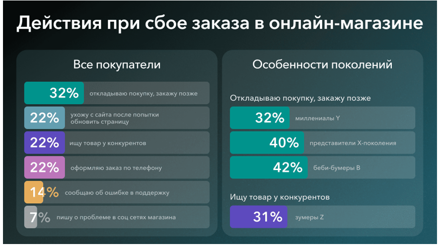 Опрос показывает, что 32% пользователей в случае ошибки откладывают оформление заказа и возвращаются к нему позже. Еще 22% покидают сайт после попытки обновить страницу. Столько же переключаются на конкурентов или звонят в магазин, чтобы оформить заказ по телефону. Только 14% сообщают о проблеме в поддержку, а 7% пишут о сбое в соцсетях магазина.